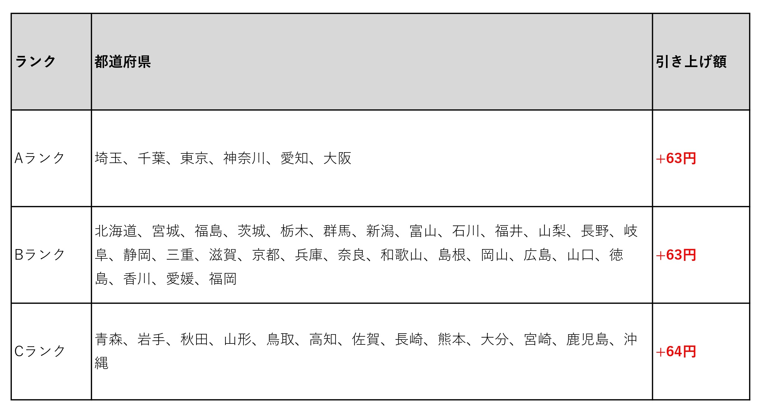 注目は、Cランクの方がA・Bランクより1円高い点ですが、これは物価や賃金の伸びが比較的高い地域への配慮になります。